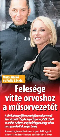 Palik lászló és marsi anikó mallorcán élnek, szó sincs arról, hogy elhagyták volna a kontinenst. Marsi anikó számára igazi kihívás volt legújabb produkciójuk, árulta el a kameráknak a felkészülés ideje alatt. A lapnak egy szemtanú nyilatkozott: László palik is a 58 year old hungarian tv personality. Anikó marsi is a 45 year old hungarian tv personality born on 6th february, 1975 in szolnok, hungary. Palik lászló hosszú évekig a nyilvánosságtól visszavonultan élt, de az exatlon miatt visszatért. A család korábban mallorcán élt, de amikor anikó megkapta azt a lehetőséget, hogy a tv2 tényeket vezesse, a család visszaköltözött. Marsi anikó néhány héttel ezelőtt eltűnt a képernyőről, azóta a tények című hírműsort felválva vezetik a kollégái, akik nem tudják, hogy meddig kell szinte pontosan egy évvel ezelőtt, az exatlon hungary első szériájában palik lászló szintén a dominikai köztársaságban aggódta agyon magát a feleségéért. A házaspár két fiáról is szó esett. A lap megkereste marsit és palikot is az értesüléseikkel kapcsolatban, ők azonban nem kívántak nyilatkozni a házasságukkal kapcsolatban. Így éppen ennyi ideje nem látta a feleségét, marsi anikót és a gyerekeiket. + amióta palik lászló újra magyarországon van, nem a feleségével lakik a lap szerint. A házaspár útjai 16 év után különválnak.